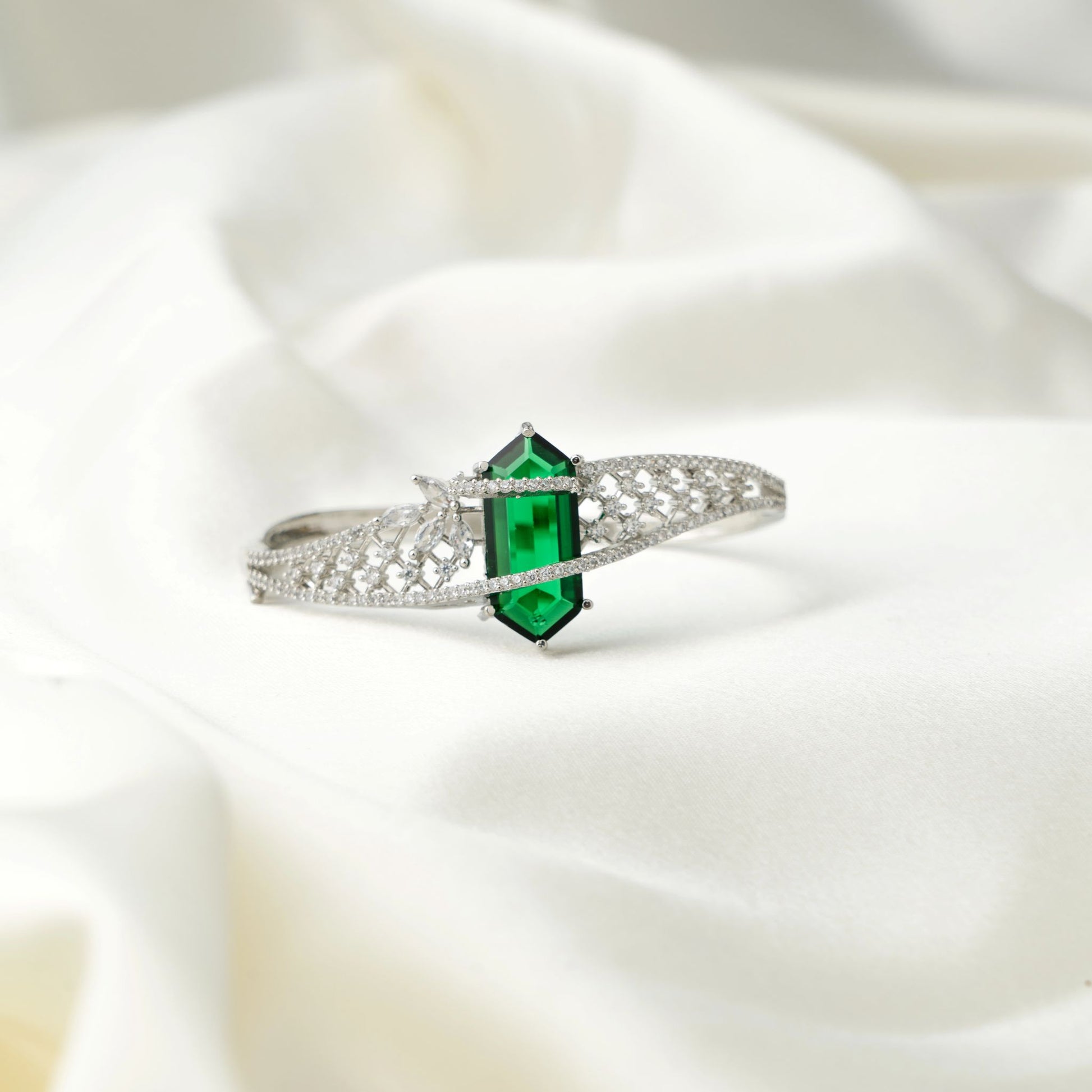 A bold statement piece featuring a striking green stone accented on each side by small white stones for an eye-catching finish.