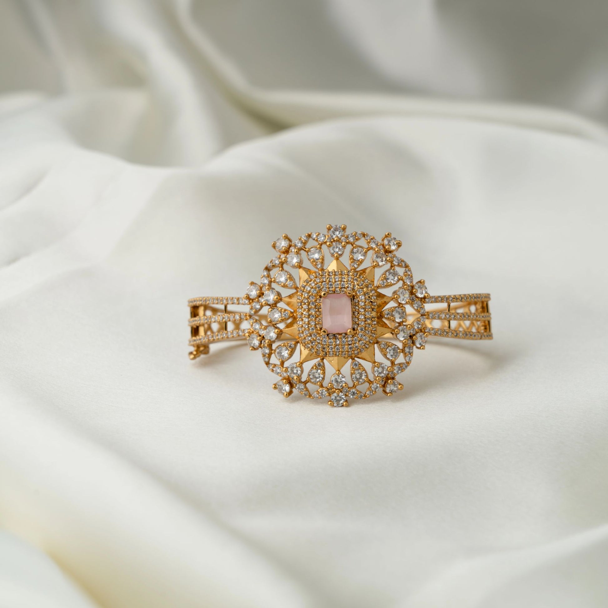 In green or pink, the central stone and clear accents come together for a classy Indian look with luminous sparkle.