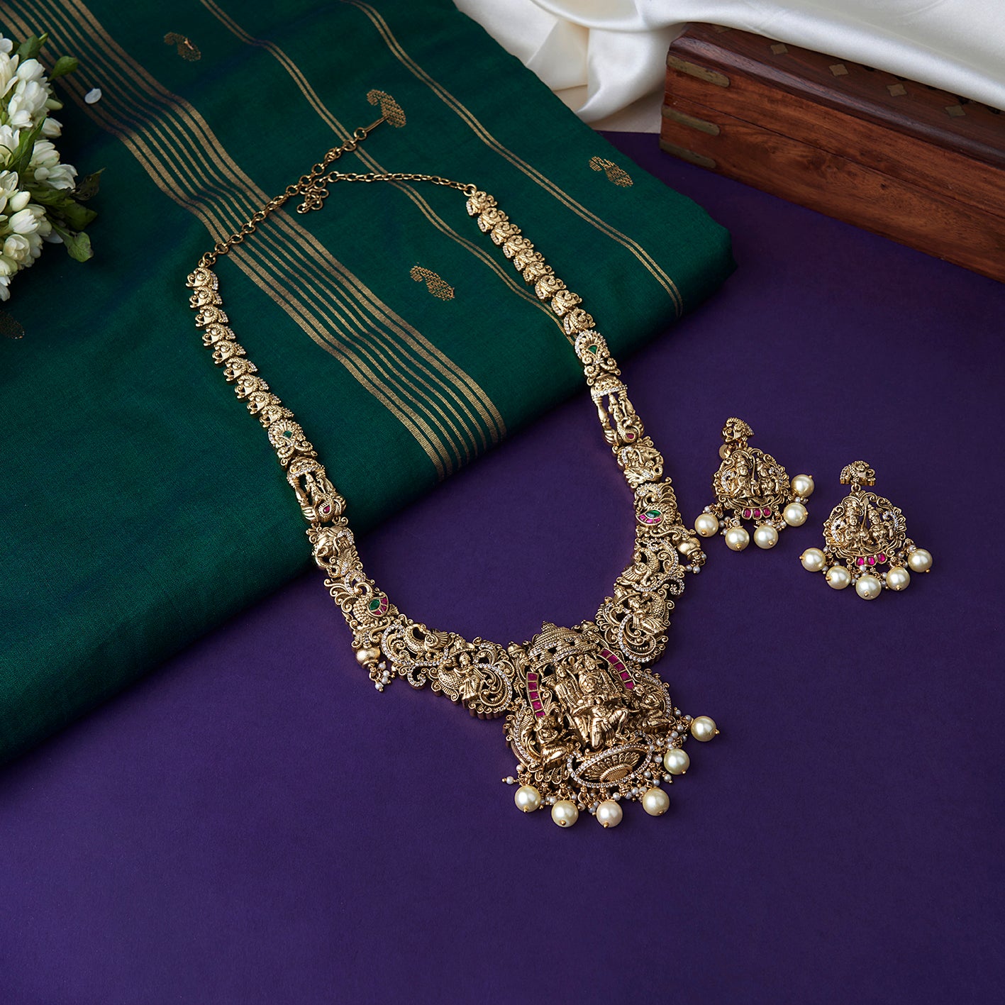 A striking Nakshi Ram Parivaar haaram with finely crafted divine motifs and matching earrings—this one jewellery is enough to complete your traditional look.