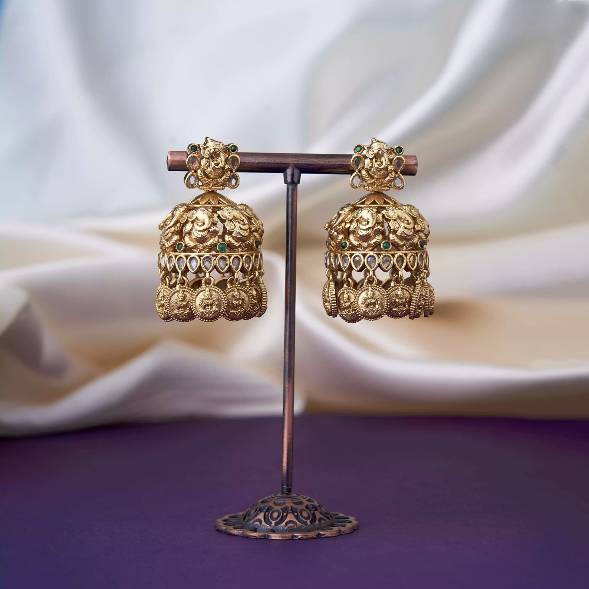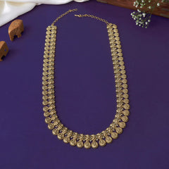 Ganesh Lakshmi Kasulu Haaram with Earrings crafted with traditional kasulu coins featuring Ganesh and Lakshmi motifs, finished with classic gold-toned detailing for a timeless festive look.