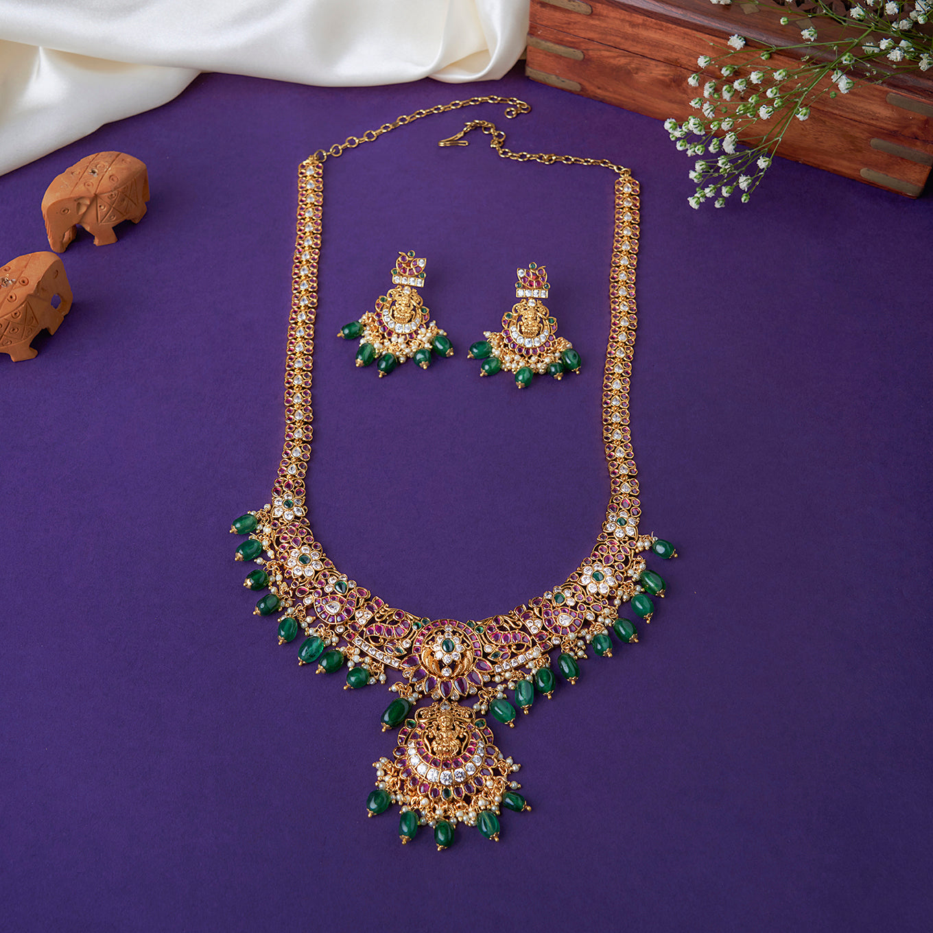 A Lakshmi haaram crafted with classic kemp stones and finished with deep green beads. A refined traditional piece suited for weddings and special festive occasions.