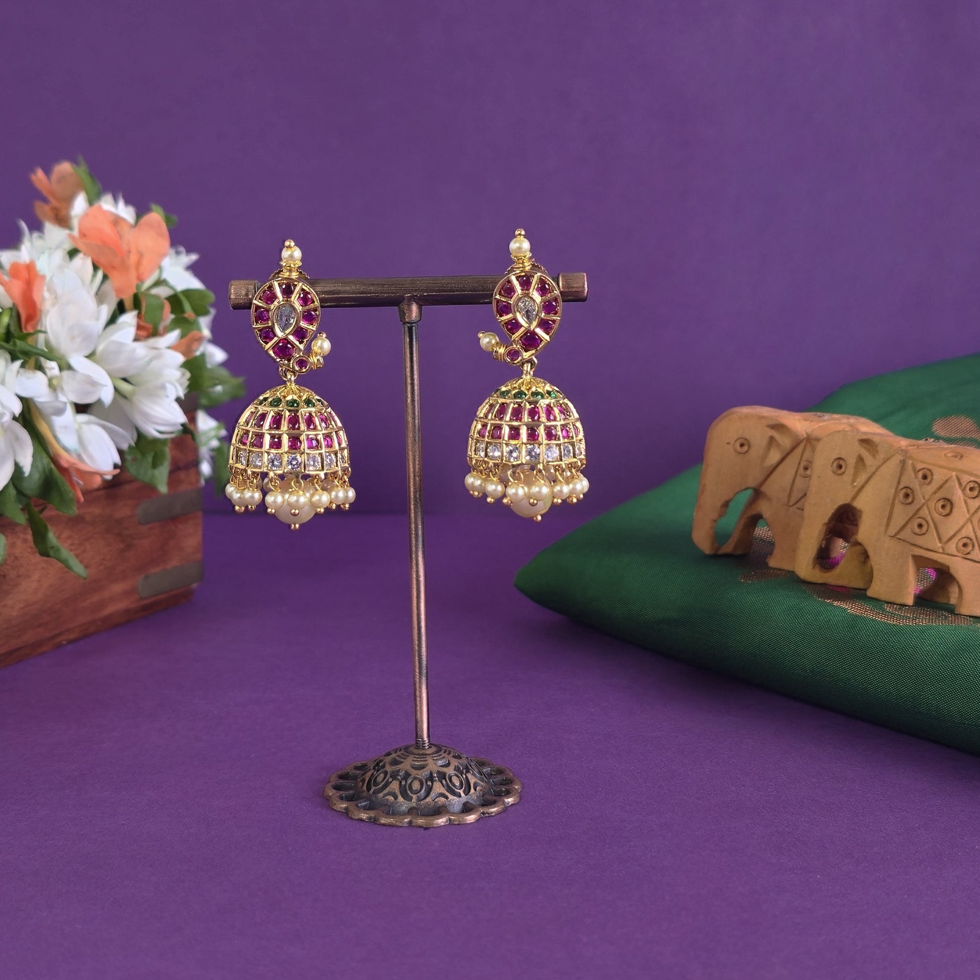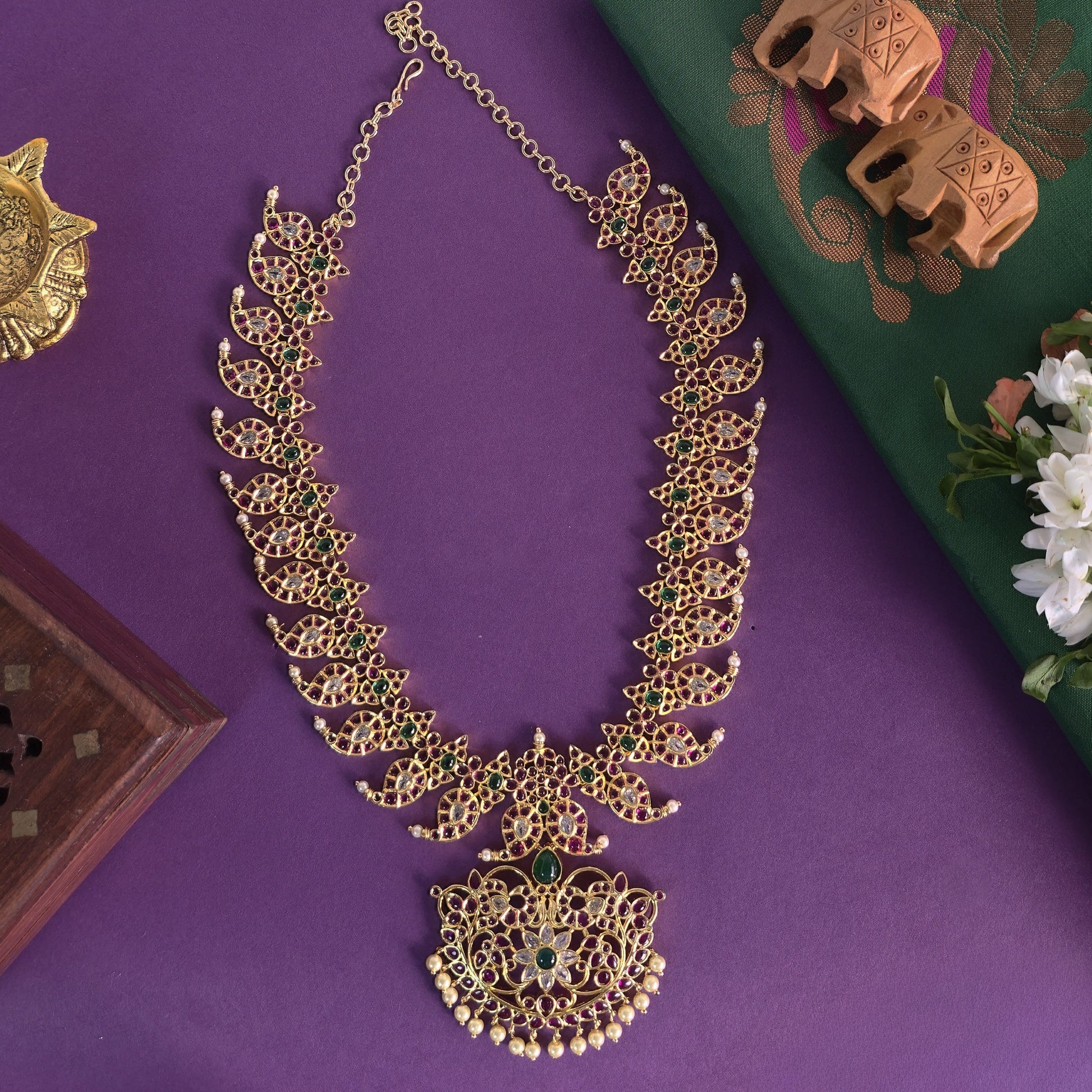 This Kemp Mango Haaram features finely detailed mango elements with a rich finish, paired with matching earrings. Designed to make a strong statement with traditional wear.
