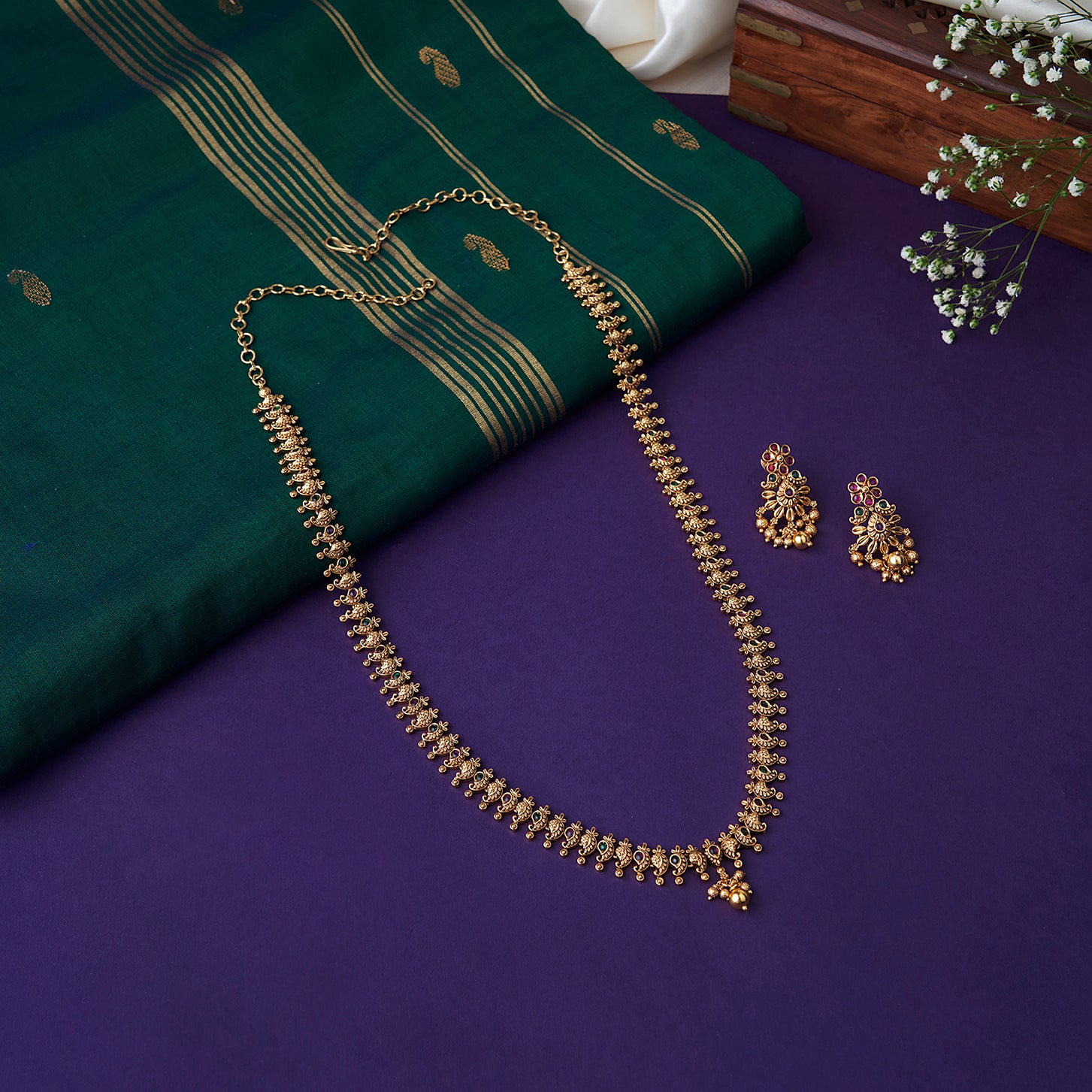 Mango haaram with a subtle, elegant design, paired with matching earrings. Ideal for enhancing festive and ethnic outfits.