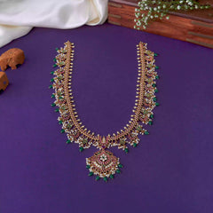 A bold and beautiful Balaji Thilakam Haaram with earrings, featuring intricate stone detailing with dangling pearls and green beads. Perfect for weddings, festive occasions and temple wear.