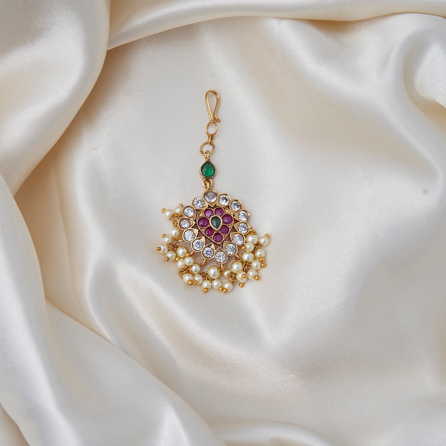 Add instant glow with this green, white, and pink stone maang tikka finished with pearl endings.
