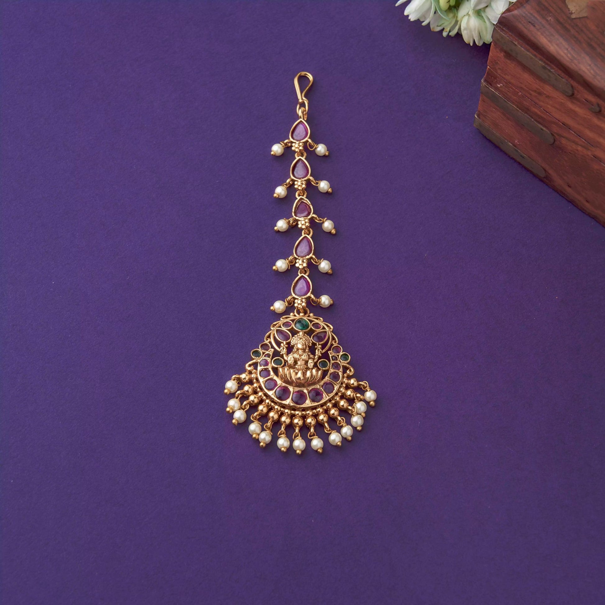 Lakshmi design highlighted with classic kemp stones, finished with pearl drops for a traditional, festive look. A perfect pick to add temple charm and instant appeal to sarees and bridal wear.