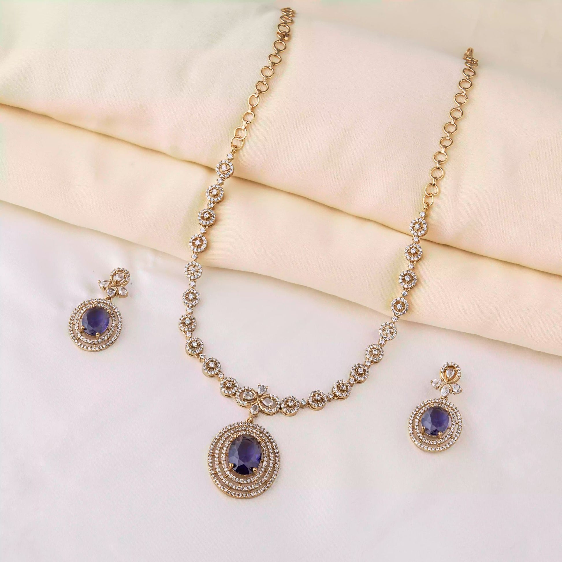 A stunning necklace with a purple stone pendant, complemented by elegant matching earrings.