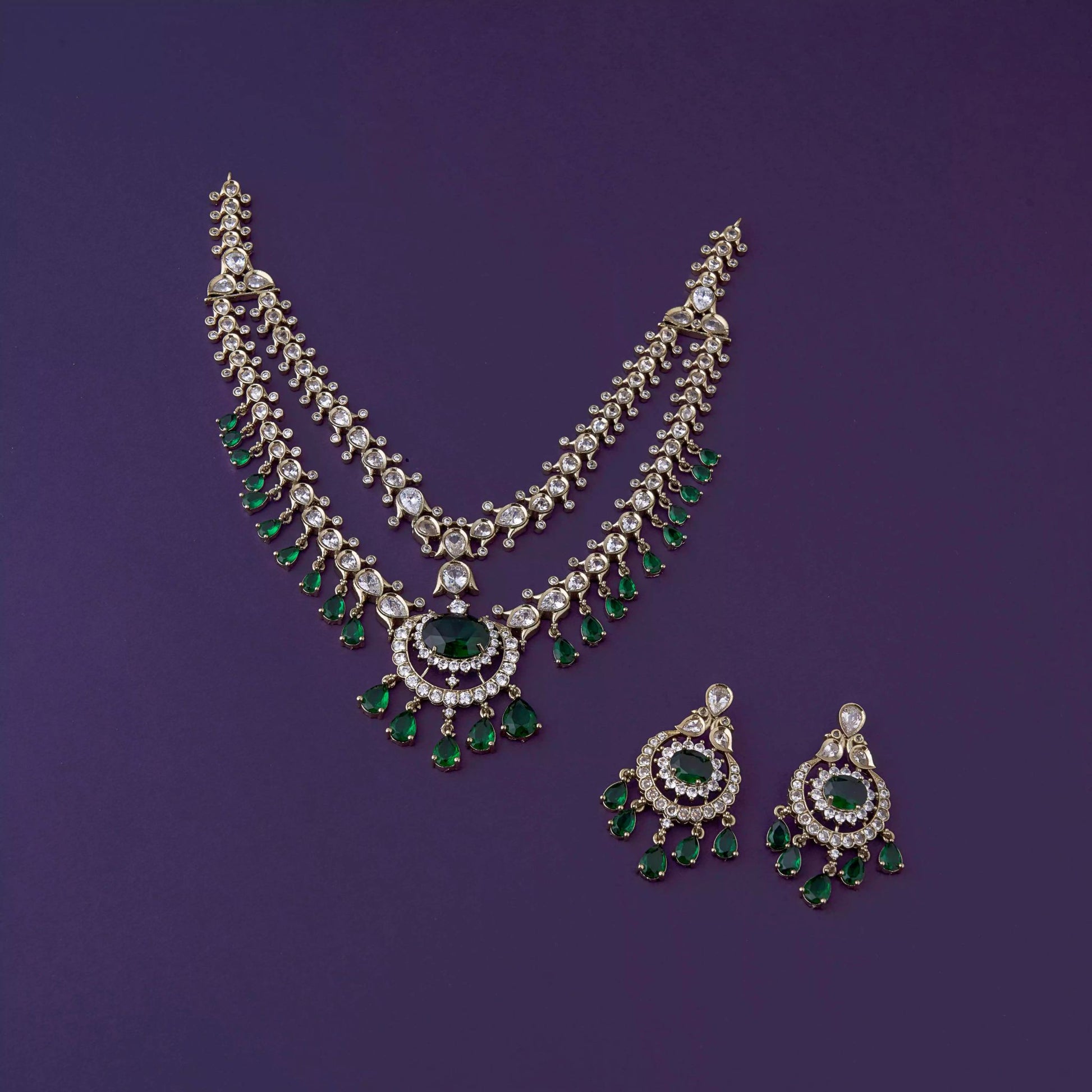 A elegant dual layer necklace with green and white stones paired with beautiful matching earrings. The layered look adds depth and elegance, making them perfect for festive wear and special occasions.