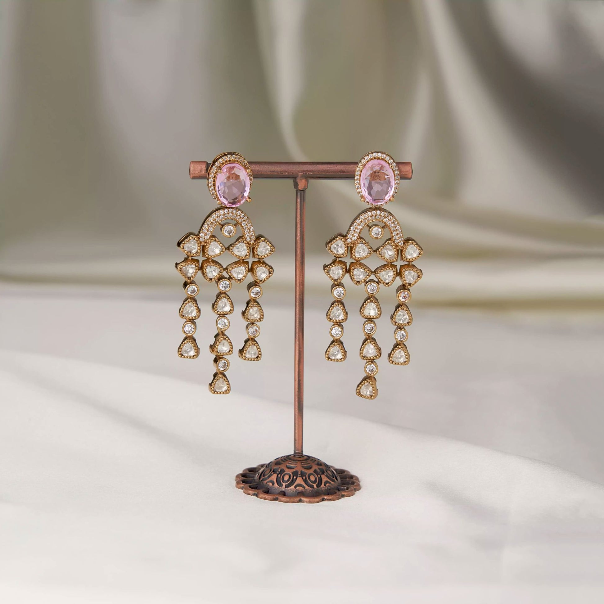 Elegant double-layered moissanite stones highlighted with two pink stones at the center create a radiant, eye-catching Design. Paired with matching earrings, this piece adds graceful sparkle and festive charm to special occasions.