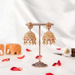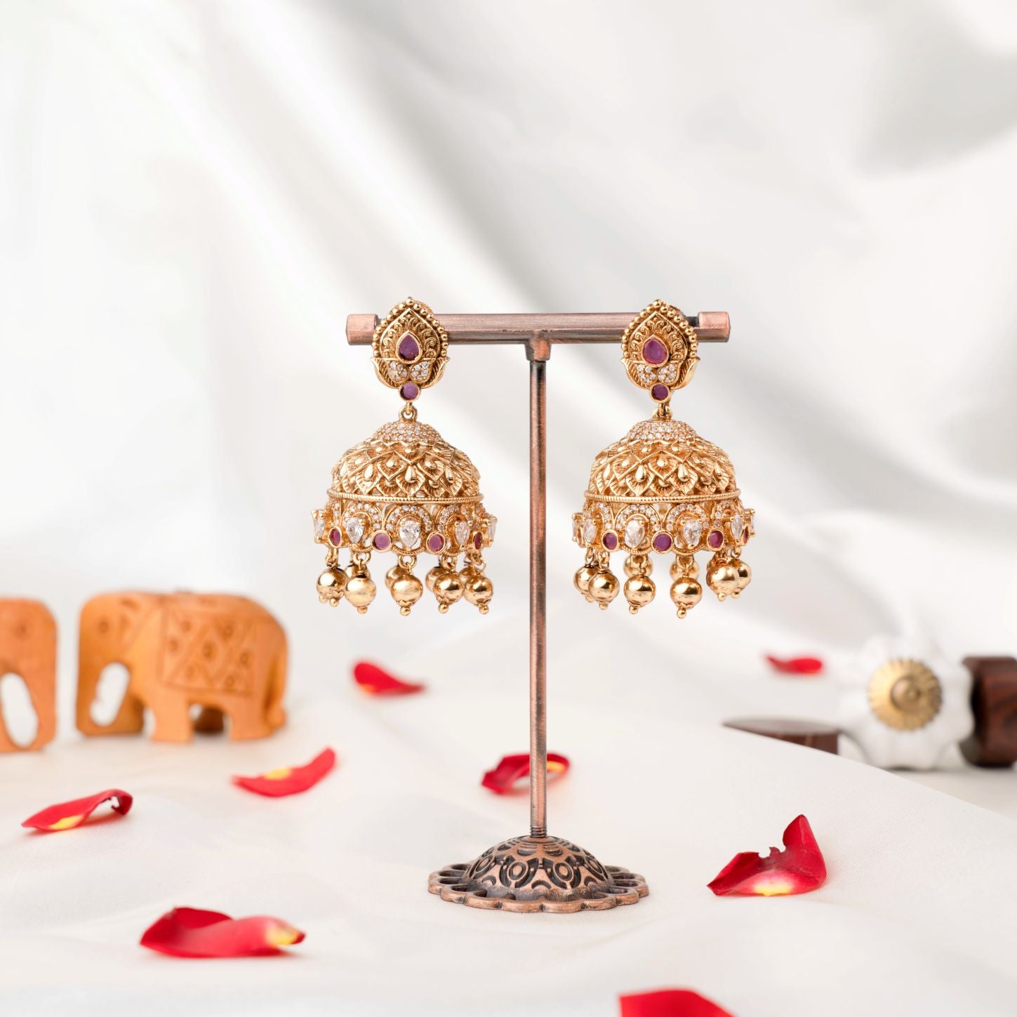 A beautiful jhumka featuring a Thilakam stud design paired with a wide dome and intricate, detailed stone work. Available in two variants—Red and Red & Green. A statement piece that elevates any look instantly.