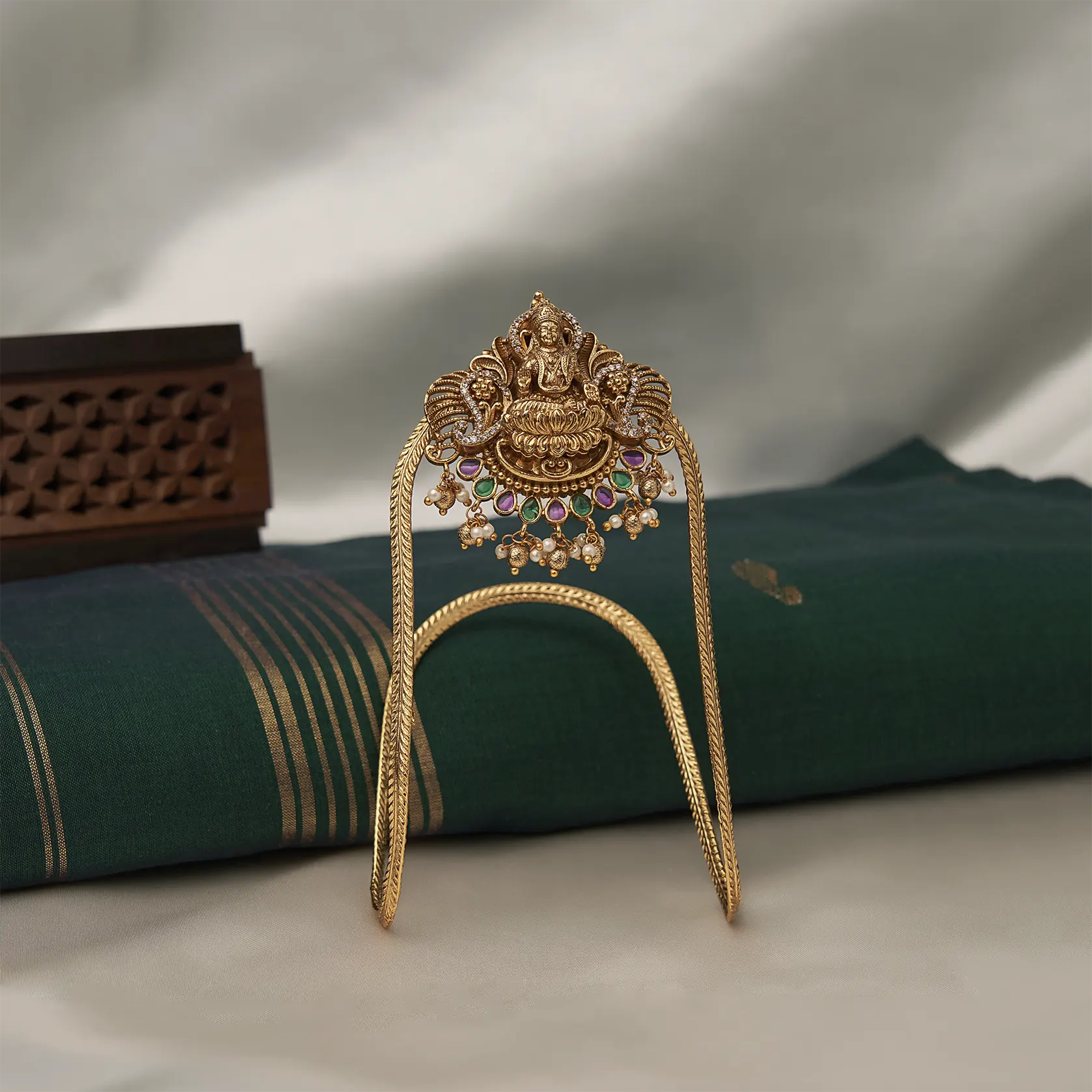 Gold-look alike Lakshmi vanki featuring pink, green, and zircon stones, finished with delicate pearl danglings—perfect for bridal and festive wear.